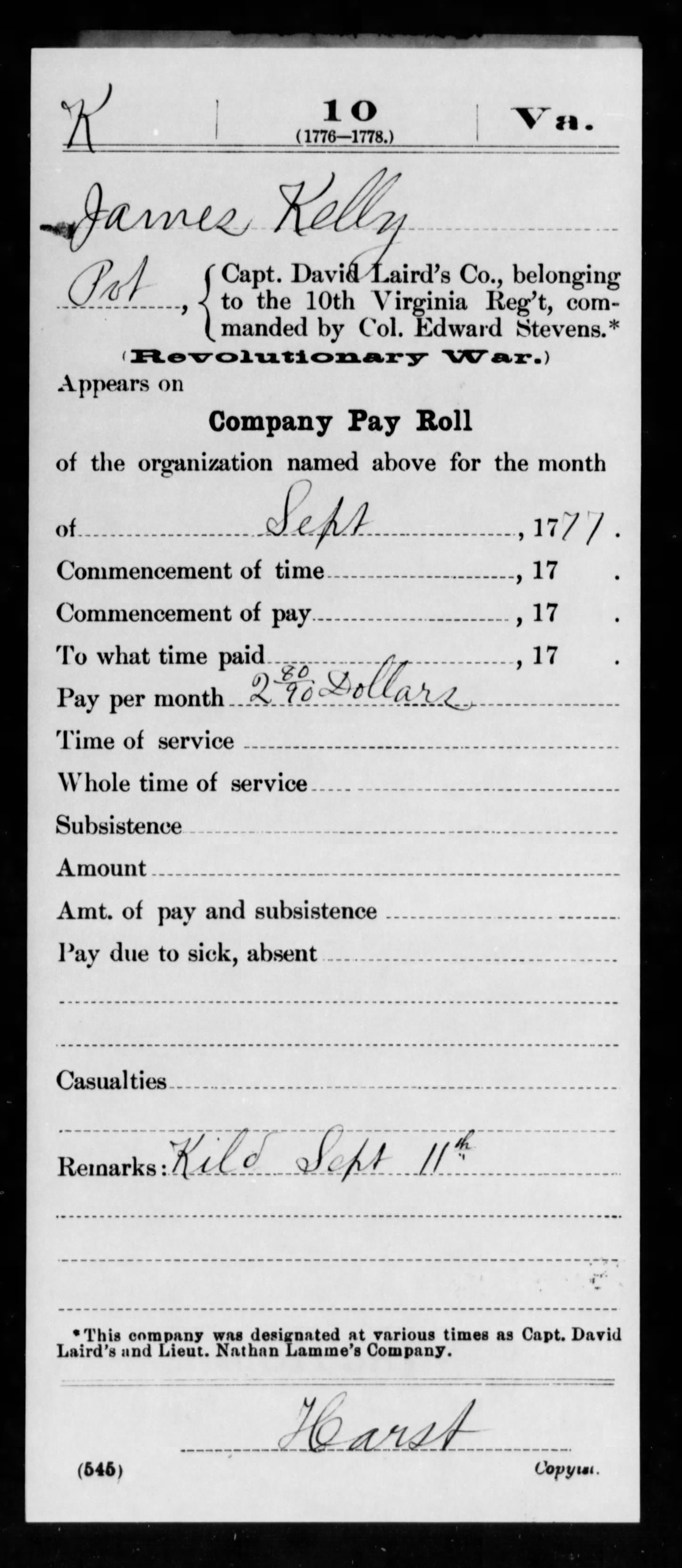 James Kelley who joined the 10th Virginia Regiment 7th Company