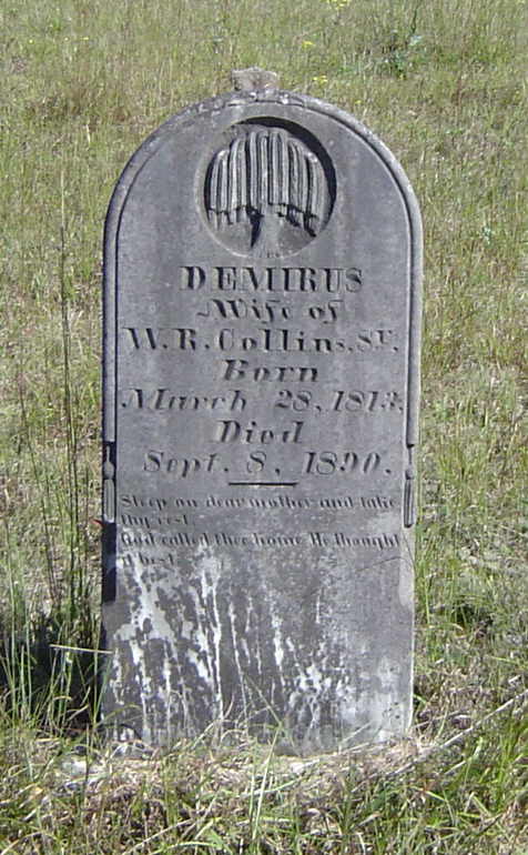 Fourth Generation108. William R Collins was born in 1819 in Madison Co, GA. William may be buried in an unmarked grave in the Collins Cemetery in Madison Co Ga. William R Collins and Demarius appeared in the census in 1860 in Madison Co, GA. They were married. Demarius was born in 28 Mar 1813 and died 8 Sept 1890 and is buried in the Collins Family Cemetery in Madison Co Ga. William R Collins and Demarius had the following children: