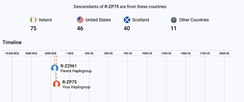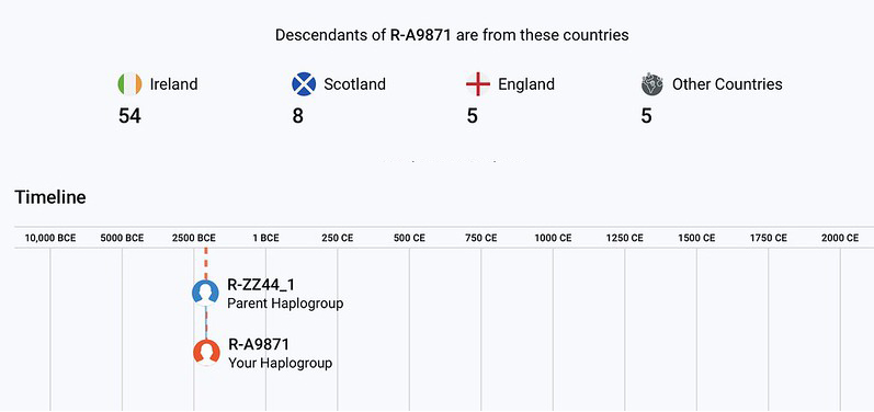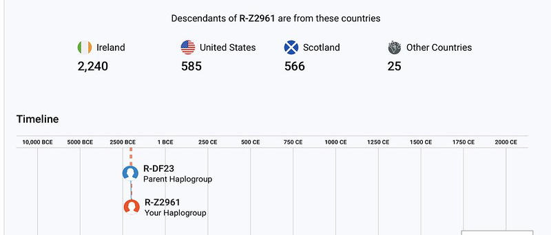 Hy-Many has a much larger number who claim Scotland as their homeland and Group 13 suggests their ancestor went to Scotland maybe about the time my ancestor went to Co Fermanagh Ireland and after about 1000 years in Scotland the Hy-Many ancestors left their Scottish cousins and migrated to Ulster where as the bio of Maine Mor suggest they were not welcome so they went to Co Roscommon Ireland.  I have two ancestors in Ireland who lived at 2000 + BCE the earliest Hy-many ancestor found in Ireland are seven remains found at Kilteasheen, Co Roscommon, they all are R-Z2961 and lived between 600 BCE and 1300 BCE.