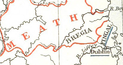 Slaine is located in Co Meath Ireland just a few miles west of Drogheda. There is some DNA evidence that puts my ancestors in this area near the time of Áed Slaine.  As stated above DNA testing was done on the remains found in Claris County Meath Ireland and the Y DNA results indicate that "Claristown 14" and I shared a grandfather about 2000 years before Claristown 14 was born and to be clear the three lines of O'Neills I describe above is much closer related to Claristown 14 than I am.  Ours is a rare connection, so far only 129 males have matched with Claristown 14 and before the arrival of the English, the Irish rarely moved so the finding of this burial in a ring ditch grave site gives reasonable cause to believe that two thousands years ago my family may have been living at or very near Slaine and they were important people.  Slaine is on the River Boyne and near the Co Louth border.  English Earl Huge O Neill's father was said to be "Matthew O'Kelley" who was also claimed to have come from the Slaine area in Ireland giving cause to believe English Earl Huge O Neill was O'Kelley of Bregia.  At thousand years after this time, a Norman family named Fleming built a stone castle at Slaine and it still remains today.  According to the "The Annals of Clonmacnoise" Aed or King Hugh made his home in Kells.