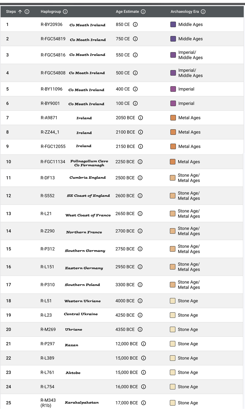 Another from the project is Q-M242 and the grandfather I share is P-P226 who lived about 32,000 years ago.