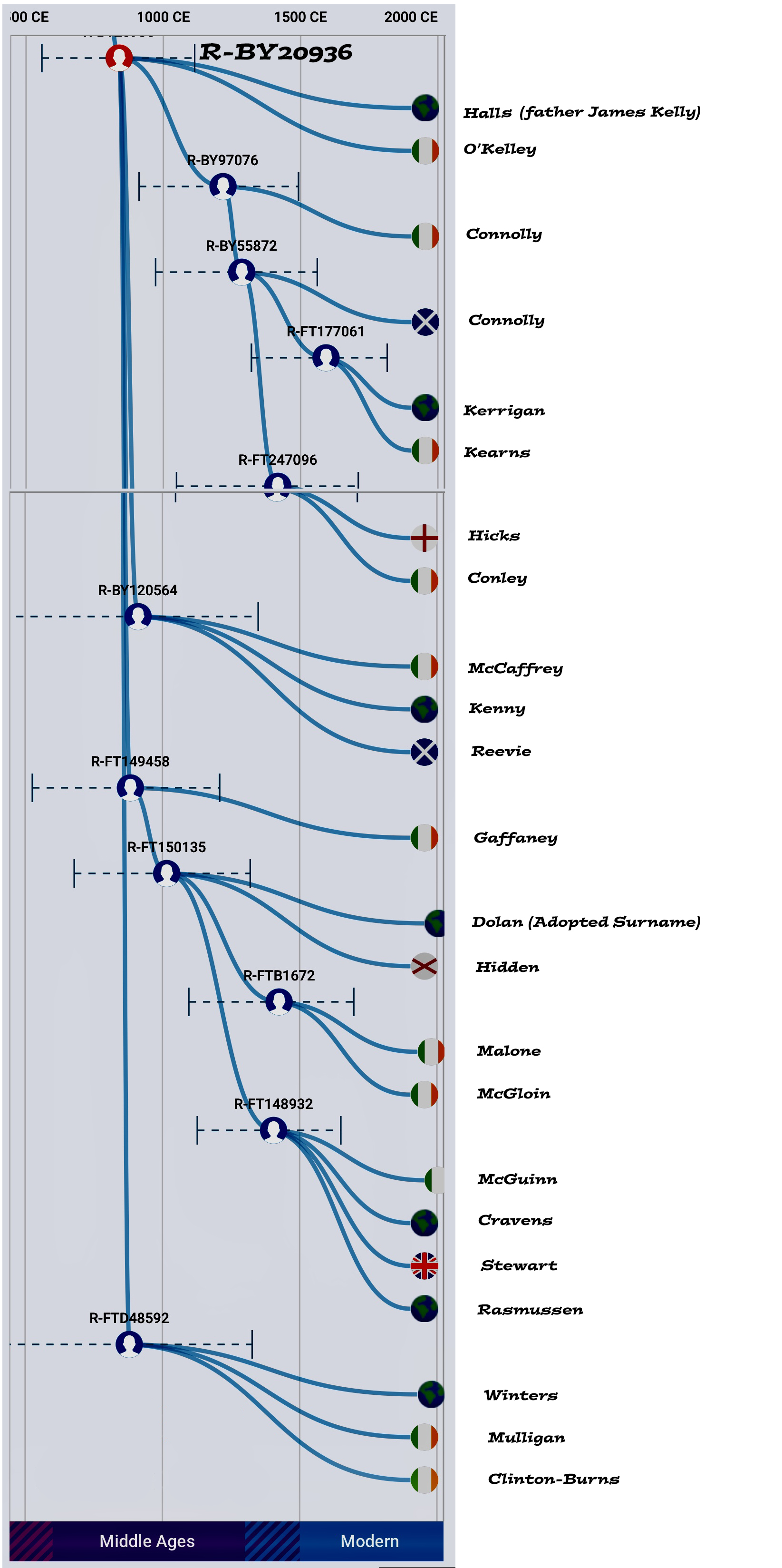 When I look at only R-Z2916 that includes all of the Group 12 Nails which also include the mythical Nail of Nine Hostages and Group 14 Hy-Many testers filtering out the early Scotts the results seem to support my belief that from R-DF13, my branch went to Co Fermanagh and their branch went to Scotland or remained in England for a time before coming to Ireland.  When I filter using R-DF75 to exclude Group 12 Nails who branch off to form their own Halpogroups I get a much reduced Hy-Many Group 14 and this R-DF75 which branched off from R-Z2916 about 1700 BCE filter excludes the 7 Kilteasheen remains found at The Bishop’s Seat, Kilteasheen, Roscommon, Ireland because they are all R-Z2961 meaning they are shared with the Group 12 Nail testers but at R-DF75 no one is O'Kelly yet because surnames won't come into use for about another 750 years.