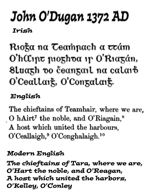 Found in the book "Irish Pedigrees" Dr John O'Hart records at generation #101 or ten generations after the 141st Irish Monarch Aedh of Slaine lived appears 172nd Monarch of Ireland Congall O'Kelley.  O'Hart calls them the "O'Kelley of Meath" but they are the O'Kelley of Bregia, the only O'Kelley that I find in Co Meath are the O'Kelley of Bregia who according to Dr John O'Donovan descends from the 141 Irish Monarch Aed Slane so O'Hart must be wrong about Co Kildare, because for Congall to have been an Irish Monarch he would have lived in Bregia.