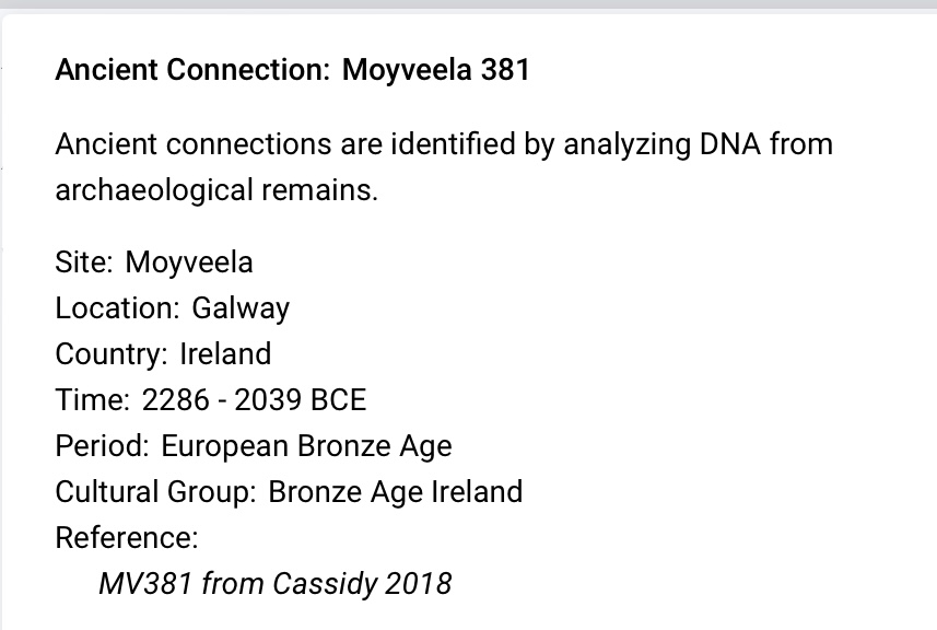 This is more complicated as the my O'Kelley of Bregia and the O'Kelly of Hy-Many share Haplogroup R-L21 and the ancient remains of Moyveela 381 who lived between 2286 -2039 BCE and found buried in Galway Ireland.  So is this OUR shared ancestor or is this the O'Kelly of Hy-Many's ancestor or it this my O'Kelley of Bregia's ancestor or none of the above, perhaps an ancestor of one of the many other Irish lines.  Since my ancestor rare match to Pollnagollum 911 appears to be older that Moyveela 381, the fact that Moyveela 381 was found in Galway suggests that Moyveela 381 might be the ancestor of O'Kelly of Hy-Many but I also have a rate match to Treanmacmurtagh 116 R-FGC11134 who lived between 2015 and 1758 found in Co Sligo.
